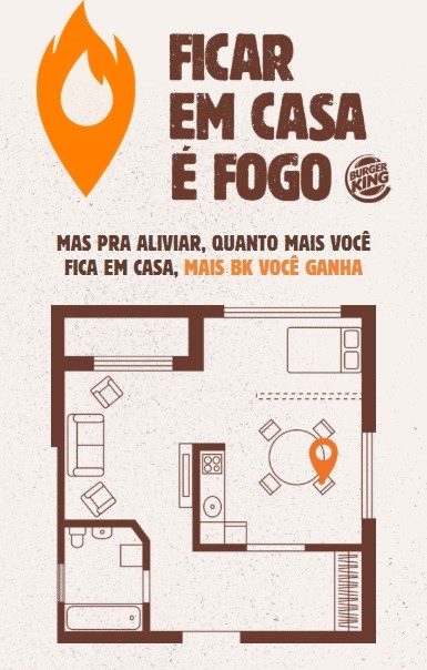 O Burger King anunciou, nesta quinta-feira (4), uma ressignificação do seu aplicativo oficial. A empresa de fast food lançou a campanha “Ficar em Casa é Fogo”, com o objetivo de recompensar os consumidores que ficarem mais tempo em casa.