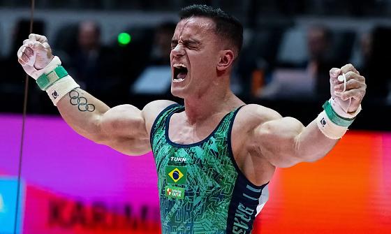 Caio Souza brilhou também na apresentação das argolas. Na saída do aparelho, cravou um triplo mortal e selou a classificação à final em oitavo lugar, atrás do belga Glen Cuyle, que ficou na sétima posição, com o mesmo somatório do brasileiro. Esta é a quarta vez que o ginasta de 32 anos vai à final de aparelhos e a sexta no individual geral.