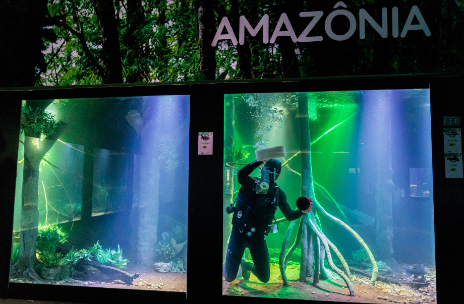 Esse processo conta com o apoio da equipe de mergulho, responsável pela aspiração do fundo dos tanques. A retirada da matéria orgânica acumulada evita a decomposição e o aumento de substâncias tóxicas, como amônia, nitrito e nitrato, que podem comprometer a saúde dos peixes. Além disso, os mergulhadores realizam a limpeza da cenografia, paredes e divisores, garantindo não apenas um visual agradável ao público, mas, principalmente, um ambiente biologicamente equilibrado.