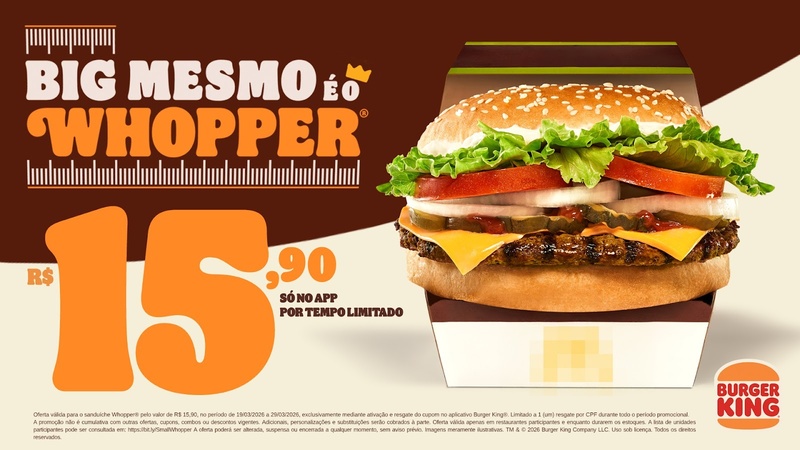Oferta válida para o sanduíche Whopper®️ pelo valor de R$15,90, no período de 19/03/2026 a 28/03/2026, exclusivamente mediante ativação e resgate do cupom no aplicativo Burger King®️. Limitado a 1 (um) resgate por CPF durante todo o período promocional. A promoção não é cumulativa com outras ofertas, cupons, combos ou descontos vigentes. Adicionais, personalizações e substituições serão cobrados à parte. Oferta válida apenas em restaurantes participantes e enquanto durarem os estoques. A lista de unidades participantes pode ser consultada em: https://bit.ly/SmallWhopper. A oferta poderá ser alterada, suspensa ou encerrada a qualquer momento, sem aviso prévio. Imagens meramente ilustrativas. TM & © 2026 Burger King Company LLC. Uso sob licença. Todos os direitos reservados.